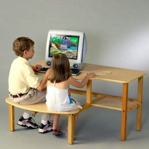 The buddy desk seats two children on the extra-wide 30.5" seat, or one child can sit in the center of the seat and use the computer. The 19" height of the Pre-school desk is recommended for children 2 to 6 years old. The 23" height of the Grade School desk is recommended for children 6 to 10 years of age.