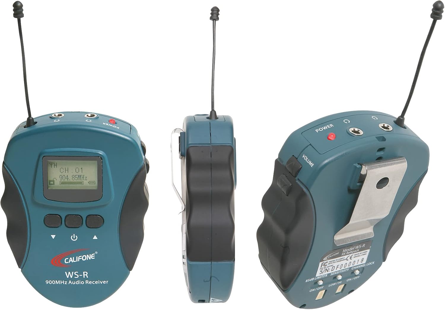 This lightweight receiver is designed for use with the transmitter from the Assistive Listening System (WS-series) or Califone 900 MHz PA products. It features dual 3.5mm headphone jacks for two simultaneous listeners coupled with a switch to restrict the volume playback so it won't exceed 85 dB for hearing safety.