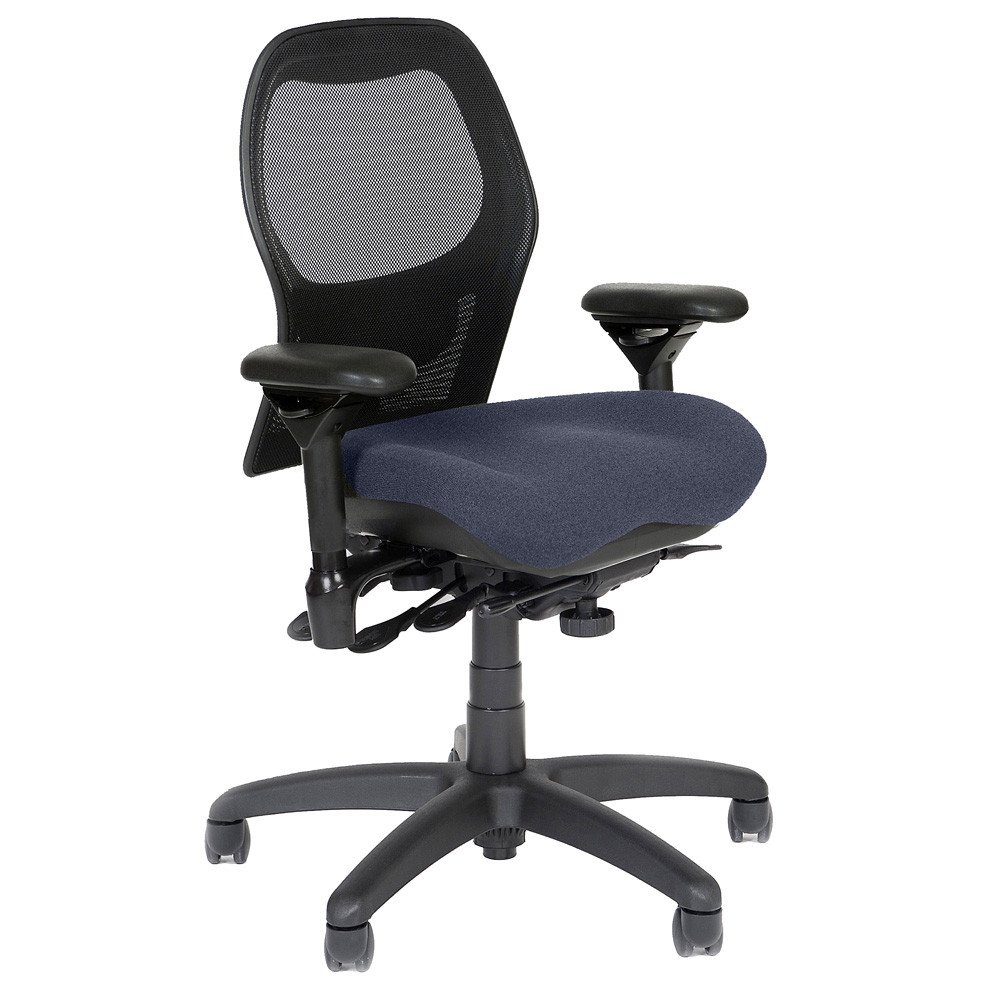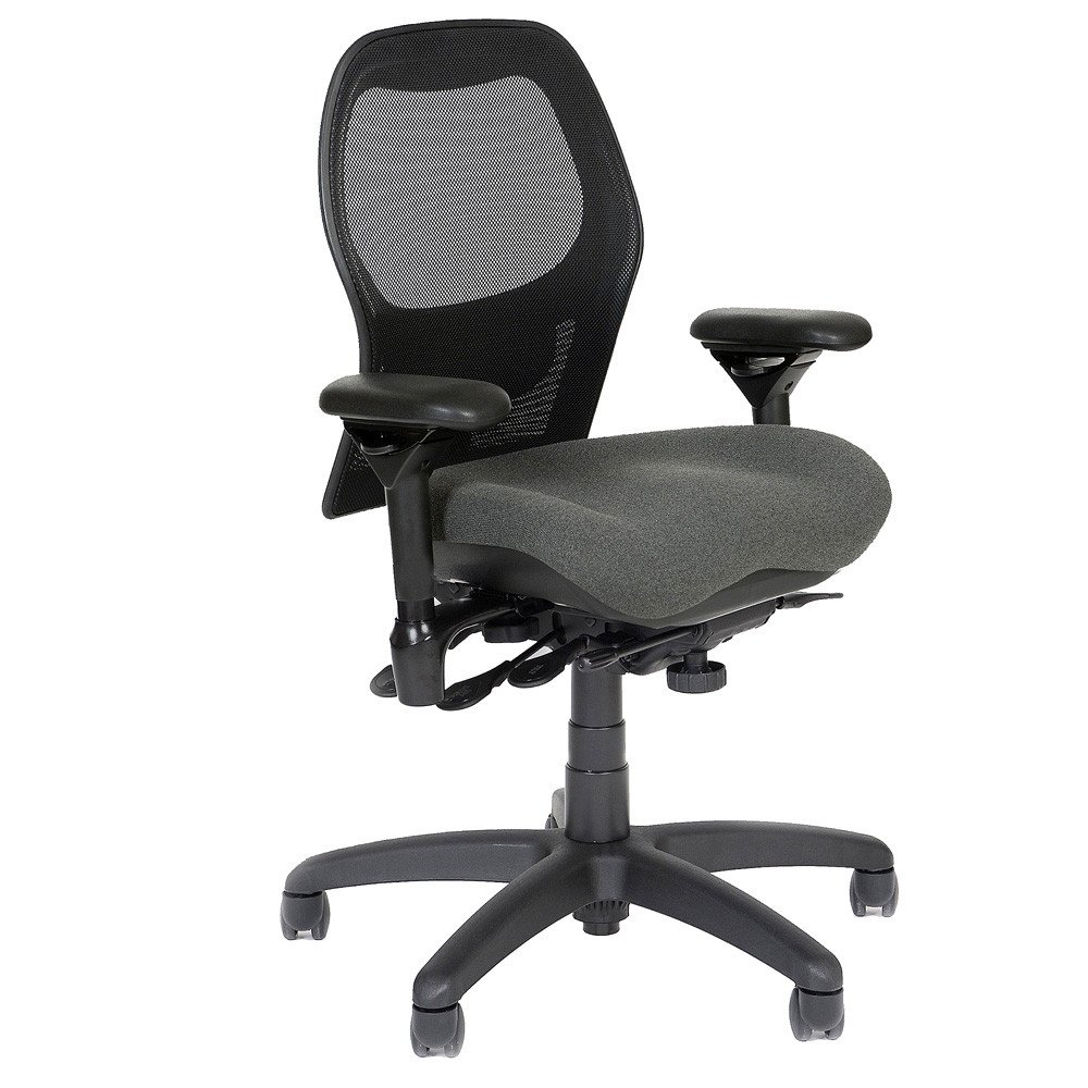 The Sola by BodyBilt offers the breathability of a mesh back, and a variety of BodyBilt seat styles. The Sola features a unique, contoured mesh back design with an adjustable, integrated lumbar support which may be set at any of eight positions. The back tilt is adjustable to preference.